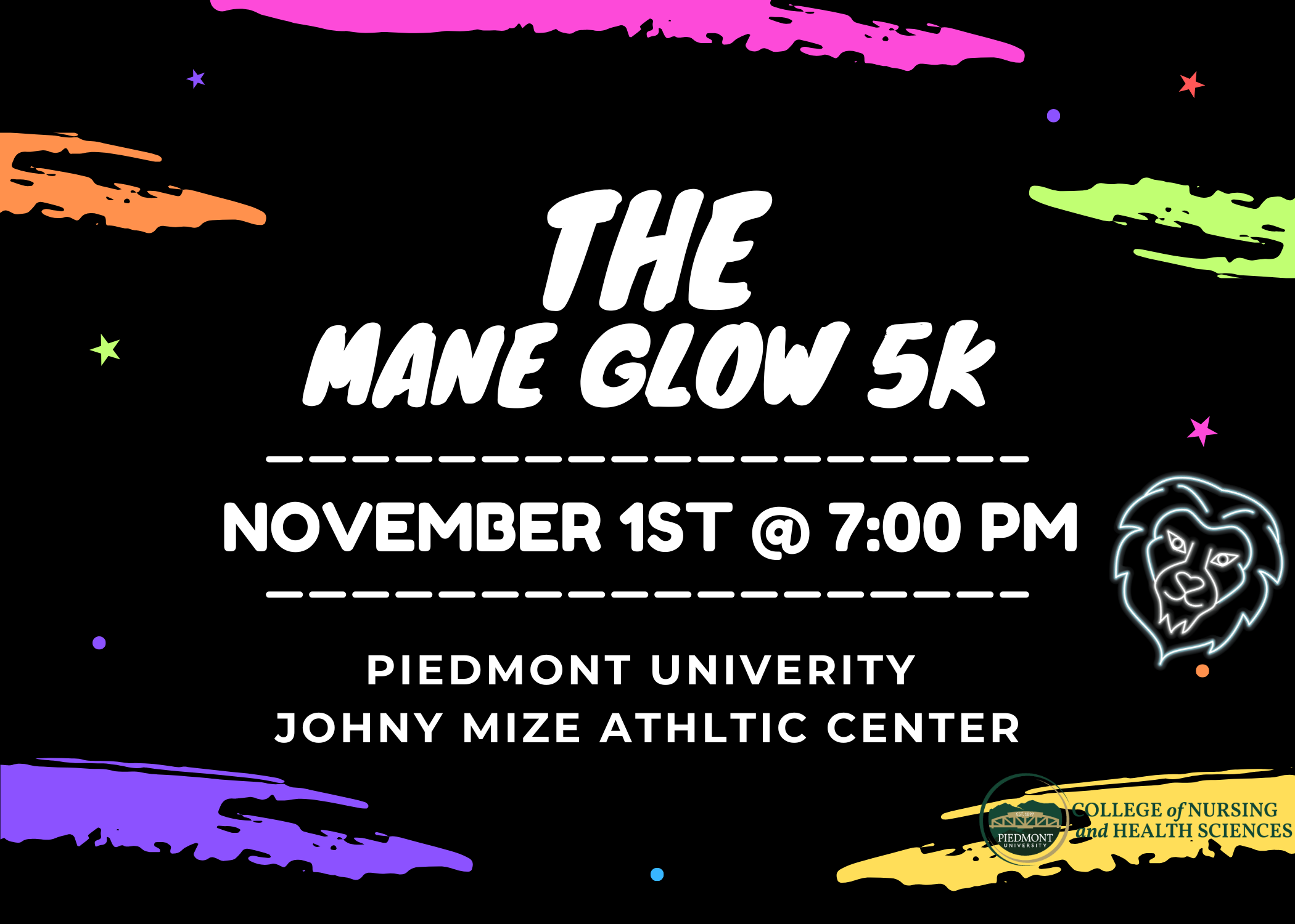 The Piedmont Univeristy Mane Glow 5k takes participants through Piedmont University's campus after dark with glow sticks to lead the way. The race will begin and end behind the Mize Athletic Center that overlooks Piedmont Unviersity's athletic complex. The course will then lead participants through the quad where academic buildings are located, across the bridge leading to the Swanson Center, and through Piedmont dormitories. The finish line will be located back at the Mize Athletic Center. Signage and color stations will lead and motivate runners around the 3.1 mile course through the campus.
